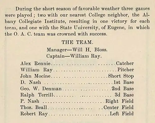 After a late start due to the inevitable spring rains for which the Willamette Valley is known, a total of three games were played in 1894 — two against Albany College, which were split, and one against the University of Oregon, won by the Aggies.[17] Manager of the 1894 hardball team was Will H. Bloss, son of the college president.[17]