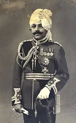 He was succeeded by his son Salim Khan. Bahadur Khan drove Chauhan Jetmalji of Dhema out of Tharad and held this estate until dispossessed by Nawab Kamal-ud-din Khan Babi, commonly known as Jawan Mard Khan II of Radhanpur State. Salim Khan ruled until 1781, when he died and was succeeded by his son Sher Khan, who killed his brothers fearing that they might compete with him for the chiefship. Sher Khan died without male issue in 1788 or 1791. He was probably poisoned by his sister. On his death his sister Sona Bubu, who had married into the Babi family, raised her son Mubariz Khan to the chiefship. The nobles displeased at her conduct, revolted and dethroning Mubariz Khan placed Shamsher Khan on the throne. Firoz Khan, son of Fateh Khan, the grandson of Firoz Khan, now preferred his claim, and, the old vassals rallying round him, gained the chiefship in 1794. The state was, in 1809, brought in contact with the British East India Company, when an agreement was entered into by the chief to pay the Gaekwad a yearly tribute of £4375 (Babashai Rs. 50,001). For some years, the chief power had been in the hands of a faction of Sindhi Jamadars, who, in 1812, under the suspicion that he was about to reduce their power, murdered Firoz Khan, when out hunting.[6] They offered the succession to his only son Fateh Khan, then thirteen years old. Fateh Khan, by the advice of his mother, refused the offer, and requested the British and Gaekwads for help and protection from his father's murderers. On this the Jamadars seized and imprisoned him, and raised his uncle Shamsher Khan, then chief of the districts of Deesa and Dhanera, to the chiefship.[7]