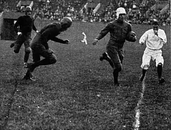 In 1914, Pitt athletic booster Joseph Trees and athletic director A. R. Hamilton hired Pop Warner as Pitt's head coach. Warner, who had previously led Carlisle, Cornell, and Georgia, had been successful at his previous stops, mentoring the likes of Jim Thorpe, and was known as an innovator of the game who originated the screen pass, single- and double-wing formations, and use of shoulder and thigh pads. His arrival at Pitt gave the program instant national credibility, lifting the perception of the program from a regional power to that of a national one.[21] Warner's impact was immediate. Led by center Robert Peck, Pitt's first First Team All-American, and All-American end James Pat Herron, Warner's first Pitt team in 1915 went 8–0, shutting out five opponents, and was trumpeted by football historian Parke H. Davis as that season's national champion.[22] His second season duplicated that success, repeating an 8–0 record while collectively outscoring opponents 255–25, and garnering what is widely regarded as a consensus national championship.[23] The lone scare of the 1916 season occurred at Navy when, following a delay of the team's train heading to Annapolis that caused a late arrival, the team overcame several fumbles and eked out a 20–19 victory.[24] The 1916 team was led again by Herron and Peck, now in his last season, as well as All-Americans fullback Andy Hastings and guard "Tiny" Thornhill. Also on that team were Jock Sutherland and H.C. "Doc" Carlson, who both would garner First Team All-American selections while members of the undefeated 1917 team, and go on to become perhaps Pitt's most legendary coaches in football and basketball, respectively. The 1917 team, nicknamed "The Fighting Dentists" because over half the roster became doctors or dentists, finished 10–0 with five shutouts despite losing several players to military service at the outbreak of World War I. The Spanish flu pandemic of 1918, which took the life of former Pitt star Tex Richards,[25] saw the implementation of quarantines that eliminated much of that year's college football season, including five of Pitt's originally scheduled contests. All of Pitt's games that year were played in November, including a high-profile game played as a War Charities benefit against undefeated, unscored upon, and defending national champion Georgia Tech, coached by the legendary John Heisman. Pitt swept through its first two games and then dismantled Georgia Tech 32–0 in front of many of the nation's top sports writers including Walter Camp. The final game of the season at Cleveland Naval Reserve resulted in Warner's first loss at Pitt and is one of the most controversial in school history. Warner, along with some reporters covering the game, insisted Pitt was robbed by the officials who, claiming the official timekeeper's watch was broken, arbitrarily ended the first half before Pitt was able to score and then allowed the Reserves extra time in the fourth quarter to pull ahead 10–9 before calling an end to the game.[26][27] Despite the loss, the 4–1 Panthers of 1918 were named by multiple selectors as a national champion for that season.[28]