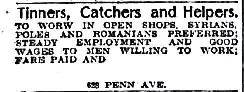Polish immigrants were highly desired by American employers for low-level positions. In steel mills and tin mills, it was observed that foremen, even when given the choice to directly employ workers of their own ethnic background, still desired to choose Poles. Steel work was undesirable to other immigrant groups, as it lasted 12 hours a day and 7 days a week, self-selecting for the most industrious and hardworking people. Polish immigrants chose to chain-market the job positions to their friends and relatives, and it was very common for a Polish friend with good English to negotiate wage rates for newer immigrants.[68] Polish Americans favored steel areas and mining camps, which had a high demand for manual labor; favorite destinations included Chicago, Detroit, Milwaukee, Cleveland, Buffalo, New York, and Pittsburgh, as well as smaller industrial cities and mining towns. Relatively few went to New England or to farming areas; almost none went to the South. Poles came to dominate certain fields of work: in 1920, 33.1% of all U.S. coal-mine operatives and 25.2% of all blast furnace laborers were Polish.[69] Polish immigrants were categorized for low-status positions within U.S. companies, as the same steel companies that recruited Polish immigrants for work in blast furnaces recruited Irish immigrants for work with finished metal.[70]