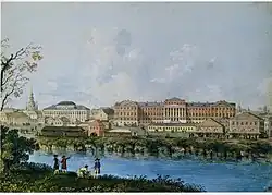 Some of the ancestors of the modern Russians were the Slavic tribes, whose original home is thought by some scholars to have been the Pripet Marshes.[26] The Early East Slavs gradually settled Western Russia in two waves: one moving from Kiev (present-day Ukraine) towards present-day Suzdal and Murom and another from Polotsk (present-day Belarus) towards Novgorod and Rostov.[27]