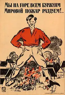 Some of the leading Bolsheviks who came to power in 1917 had been pamphleteers or editors, including Lenin, Trotsky, Stalin, Bukharin, and Zinoviev. Lenin set up the daily newspaper Pravda in January 1912. Before it was suppressed by the government in 1914 it was a "singularly effective propaganda and educational instrument which enabled the Bolsheviks to gain control of the Petersburg labour movement and to build up a mass base for their organization."[17] Under Lenin, the Bolsheviks controlled all of the media after 1917. The major national newspapers were Izvestia (the voice of the government),[18] and especially Pravda (the voice of the party).[19] Pravda acquired the first and best printing equipment for illustrations.[20] The leading newspapers developed a specialized rhetorical vocabulary designed to enhance the totalitarian structure of society, with total truth emanating from the top, and all sorts of mischievous errors stemming from clumsy bureaucrats at lower levels, or from devious traitors and spies working on behalf of capitalism.[21]