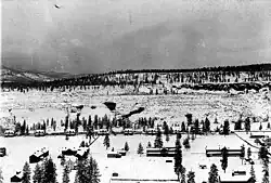 The 1920 census showed a net increase of just 35 individuals, which actually indicates that thousands left the city when considering the natural growth rate of a population.[95] The 1920s and 1930s saw the similar, but less drastic slow growth of the 1910s, and this change of outlook forced city boosters to market the city as a quiet, comfortable place suitable for raising a family rather than a dynamic community full of opportunity.[99] The Inland Northwest region was heavily dependent on extractive products produced from farms, forests, and mines which experienced a fall in demand.[100] In Coeur d'Alene the Depression years saw a decline in lumber demand and by the mid 1930s about half the woodworkers in northern Idaho were laid off and the surviving mills were producing only 160 million board feet of lumber per year.[101]