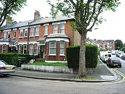 While strictly speaking not properly part of Stroud Green, Womersely House, close by the St Peter-in-Chains catholic church, has already been noted as home to the Turner family, prominent local landowners in the late 19th century, who had previously occupied Stapleton Hall. By the early 20th century however it was a hostel for single working women.[47] It occupied a plot of land bordered by Elm Grove and Womersley Road, and had been demolished by 1947 as can be seen on various RAF aerial survey photos on the Historic England website.[29] The site is currently (March 2008) being re-developed.