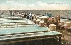 Jesuit missionaries visiting the Syracuse region in the mid 1600s reported brine springs around the southern end of "Salt Lake", known today as Onondaga Lake. In 1788 the Treaty of Fort Stanwix, and the subsequent designation of the area as the Onondaga Salt Springs Reservation by the state of New York,[3] provided the basis for commercial salt production from the late 1700s through to the early 1900s. Brine from wells that tapped into halite (common salt) beds in the Salina shale near Tully, New York, 15 miles south of the city, were developed in the 19th century. It is the north-flowing brine from Tully that is the source of salt for the "salty springs" found along the shoreline of Onondaga lake. The rapid development of this industry in the 18th and 19th centuries led to Syracuse's nickname—"The Salt City".[4]