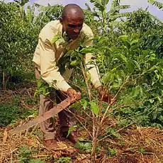 Crops grown in the country include coffee, tea, pyrethrum, bananas, beans, sorghum and potatoes. Coffee and tea are the major cash crops for export, with the high altitudes, steep slopes and volcanic soils providing favourable conditions. Reliance on agricultural exports makes Rwanda vulnerable to shifts in their prices.[21] In 2019 agriculture accounted for 29% of the economy of Rwanda.[14] Rwanda produced in 2019:[22] Bananas, pineapples, tea, coffee, and tobacco are high-value, export-oriented products.[22]