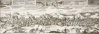 In 1610, the city was racked by a large fire.[21] In 1655, during the First Northern War, Vilnius was captured by the forces of Tsardom of Russia and was pillaged, burned and the population was massacred. The death toll of around 20,000 included a large proportion of Vilnius Jews.[22] The city's growth lost its momentum for many years, yet the number of inhabitants recovered. During the Commonwealth's decline, Vilnius became known as "Jerusalem of the North" - a major religion-cultural centre of Eastern European Jewry.[23] In 1769, the Rasos Cemetery was founded; today it is one of the oldest surviving cemeteries in the city.