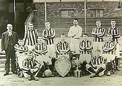 Albion secretary Frank Heaven resigned in May 1902, and was replaced by 19-year-old Fred Everiss, who remained in the post of secretary-manager for 46 years.[9] The team performed well on their return to Division One, topping the league for a large part of the season, but their title hopes were ended by a run of 11 games without a win—including eight straight defeats—and they finished seventh.[10] Disagreements in the boardroom in the summer of 1903 led to the resignation of three directors, including chairman Harry Keys. Albion won just seven league games in 1903–04, and were again relegated as the First Division's bottom club.[9] This time there was no quick return as the club finished tenth in Division Two, three points clear of having to apply for re-election. The 1905–06 season saw a marked improvement, with a 16-match unbeaten run between October and January helping the team to a 4th-place finish.[11] In 1906–07, Fred Shinton finished as top scorer in Division Two, with 28 league goals.[8]