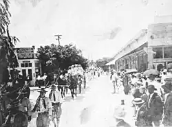 On November 5, 1894, residents met at the "Calaboose", which served as the first jail and police station. The building formerly stood at Clematis Street and Poinsettia, now Dixie Highway. The 78 people there voted on a motion to incorporate, with 77 in favor and 1 against. They also decided to name the municipality "West Palm Beach", originally a town.[17] This made West Palm Beach the first incorporated municipality in the county and in Southeast Florida.[18] On the following day, 78 people also met to vote on the new town officers. Voters elected John S. Earman as the first mayor, while Henry J. Burkhardt, E. H. Dimick, J. M. Garland, H. T. Grant, J. F. Lamond, and George Zapf became the town's first aldermen. Eli Sims and W. L. Tolbert were chosen to be town clerk and town marshal, respectively.[19] Later in November 1894, the Flagler Alerts, an all-volunteer fire department, was established as the first fire department in the city.[15]