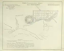 In 1770 the fortress of Aleksandrovskaya (Александровская) was erected and is considered to be the year of the foundation of Zaporizhzhia. As a part of the Dnieper Defence Line the fortress protected the southern territories of Russian Empire from Crimean Tatar invasions.[1] It is uncertain in whose honour the fortress was named. Some believe that it was Alexander Mikhailovich Golitsyn, the general who served Catherine the Great.[2] Other possibilities are Prince Alexander Vyazemsky[1][3] or Alexander Rumyantsev.[4]