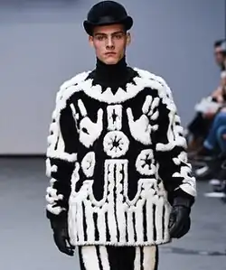 In 2015, London-based design house KTZ released a collection which included a number of Inuit-inspired garments. Of particular note was a sweater with designs taken directly from historical photographs of an Inuk shaman's unique caribou parka.[190] The garment, known variously as the Shaman's Parka or the Inuit Angakkuq Coat, is well-known to scholars of Inuit culture; Bernadette Driscoll Engelstad described it as "the most unique garment known to have been created in the Canadian Arctic."[191][192] It was designed in the late 19th century by the angakkuq Qingailisaq and sewn by his wife, Ataguarjugusiq. Either Qingailisaq or his son, the angakkuq Ava, sold the coat to Captain George Comer in 1902, who brought it to the American Museum of Natural History.[f][5][192] Its intricate designs, which resemble Koryak and Chukchi motifs, were inspired by spiritual visions.[5] Ava's great-grandchildren criticized KTZ for failing to obtain permission to use the design from his family.[190] After the criticism was picked up by the media, KTZ issued an apology and pulled the item from the market.[193] French fashion designer Joseph Altuzarra had also drawn inspiration from the Shaman's Parka in his Fall/Winter 2012 collection, but to a lesser degree that did not result in controversy.[194]