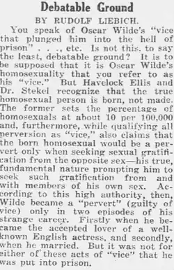 In the United States, as early as the turn of the 20th century, several groups worked in hiding to avoid persecution and to advance the rights of homosexuals, but little is known about them.[59] Edward Irenaeus Prime-Stevenson published Imre: A Memorandum in 1906 and The Intersexes in 1908.[60] A better documented group is Henry Gerber's Society for Human Rights (formed in Chicago in 1924), which was quickly suppressed within months of its establishment.[61] Serving as an enlisted man in occupied Germany after World War I, Gerber had learned of Magnus Hirschfeld's pioneering work. Upon returning to the U.S. and settling in Chicago, Gerber organized the first documented public homosexual organization in America and published two issues of the first gay publication, entitled Friendship and Freedom. Meanwhile, during the 1920s, LGBT persons found employment as entertainers or entertainment assistants for various urban venues in cities such as New York City.[62]