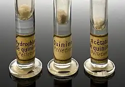 French chemist Pierre Joseph Pelletier and French pharmacist Joseph Bienaimé Caventou separated in 1820 the alkaloids cinchonine and quinine from powdered fever tree bark, allowing for the creation of standardized doses of the active ingredients.[55] Prior to 1820, the bark was simply dried, ground to a fine powder and mixed into a liquid (commonly wine) for drinking.[56]