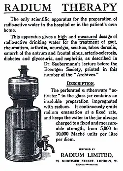 Many products which imitated emanation activators were more broadly marketed to the public. One such product was the Revigator, a "radioactive water crock." A dispensing jar made of radium-containing ore, the idea was that radon produced by the ore would dissolve in the water overnight. It was advertised: "Fill jar every night. Drink freely ... when thirsty and upon arising and retiring, average six or more glasses daily." The American Medical Association (AMA) was concerned that the public was being fleeced by charlatans. In response, the AMA established guidelines (in effect from 1916 to 1929) that emanators seeking AMA approval had to generate more than 2 μCi (74 kBq) of radon per liter of water in a 24-hour period. Most devices on the market, including the Revigator, did not meet that standard.[41]