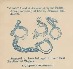 Richmond was a hub and the largest seller of enslaved people in Virginia.[72][73] When enslaved people were sold, it meant that communities and families were subject to being dispersed to different places.[72] It was common for people to be separated from their spouses and children, perhaps for the rest of their lives.[72] People were taken from the plantation and put into jails or slave pens of slave traders. They might be held there for weeks and were subject to intrusive physical inspections. When they were auctioned, they could be sold again to another trader or ultimately sold to work on plantations in the Lower South.[72]
