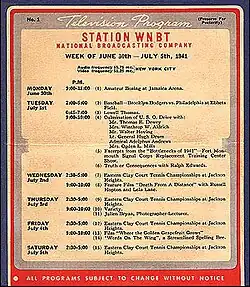 CBS began experimental color field tests using film as early as August 28, 1940, and live cameras by November 12.[122] NBC (owned by RCA) made its first field test of color television on February 20, 1941. CBS began daily color field tests on June 1, 1941.[123] These color systems were not compatible with existing black-and-white television sets, and as no color television sets were available to the public at this time, viewing of the color field tests was restricted to RCA and CBS engineers and the invited press. The War Production Board halted the manufacture of television and radio equipment for civilian use from April 22, 1942, to August 20, 1945, limiting any opportunity to introduce color television to the general public.[124][125]