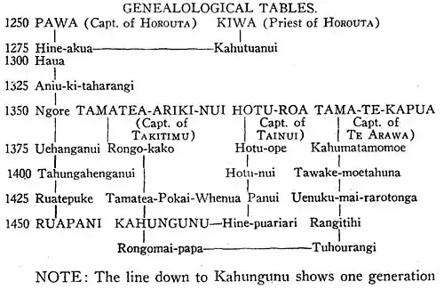 - ^ a b c d e Tiaki Hikawera Mitira (J. H. Mitchell) (1972) [1944]. "Chapter Two – The History of Horouta and that of Pawa (her Commander) and Kiwa (the Priest)". Takitimu. Wellington, New Zealand: Reed Publishing. ISBN 9781927203361. Retrieved 14 June 2016.