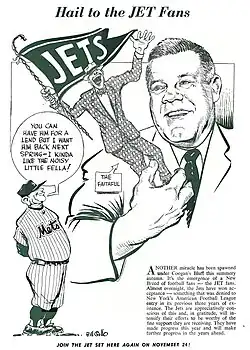 New York hoped to improve its fortunes through the AFL draft, but most Titans draftees signed with the NFL.[26] The Titans won only one preseason game, before a crowd of 73,916 against the Patriots in Philadelphia – free tickets had been given to anyone who bought $10 in groceries at an Acme Market. The New York Times columnist Howard Tuckner described the crowd as "presumably well-fed."[27] The 1961 season, which ended at 7–7, was marked by financial difficulties, as the paychecks of many players bounced; team members learned to hurry to the bank as soon as they received their pay. At the end of the season, Wismer announced that Clyde "Bulldog" Turner would be the Titans' head coach in 1962.[28] Baugh had a contract for 1962 and would have to be paid unless he quit. Although Wismer did not fire Baugh, he also did not tell him where the team's 1962 training camp would be. Baugh showed up anyway, and spent several days acting as kicking coach before Wismer came to the conclusion that Baugh would not quit. The team owner finally agreed to pay the coach his 1962 salary in monthly installments, although Baugh later stated that he was never paid.[29] Baugh's 14–14 record stood as the best mark by any Titans/Jets coach until bettered by Bill Parcells in 1997–1999.[28] In the offseason, Wismer hoped to bring a star to the Polo Grounds by drafting Heisman Trophy winner Ernie Davis of Syracuse, but Davis was drafted by the Redskins instead, traded to the Browns, and died of leukemia before ever playing a professional game.[30]