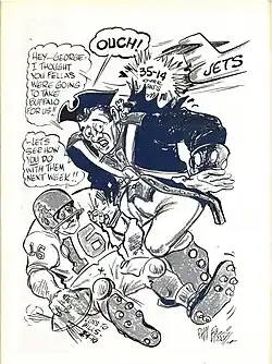 In 1968, Werblin's co-owners gave him an ultimatum – either buy them out or be bought out. He chose the latter option, reportedly profiting $1.4 million for his 1963 investment of $250,000.[58] Prior to Werblin's departure, the Jets had considered firing Ewbank.[59] They attempted to secure Green Bay Packers coach Vince Lombardi, but Lombardi decided to remain in Green Bay one more season.[60] The season started with the usual three road games due to the team's status as secondary tenant to the Mets at Shea Stadium. The Jets rose to the top of the AFL East; they had lost only two games by mid-November and built a three-game lead over second-place Houston. New York's next game was at Oakland. In what became known as the Heidi Game, the Jets took a 32–29 lead with 68 seconds left, only to have Oakland score two touchdowns to win the game. However, the touchdowns went unseen by much of the national TV audience, as NBC had switched at 7:00 p.m. to a TV movie of Heidi.[61] Nevertheless, the Jets won their remaining games to finish 11–3.[61] In the playoffs, the Jets defeated the Raiders for the AFL Championship at Shea Stadium, 27–23, a game in which Namath threw three touchdowns, including the game winner to Don Maynard in the fourth quarter.[62]