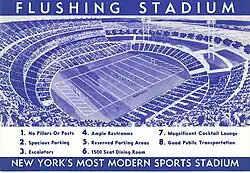 New York City had proposed to build a new stadium for its franchise in baseball's stillborn Continental League. When that league dissolved and the city was awarded a franchise, dubbed the New York Mets, in the National League, plans for a stadium continued. Wismer had hoped the Titans could play in the new stadium, to be built at Flushing Meadows in Queens, beginning with the 1961 season, but funding difficulties and legal problems delayed construction. Wismer signed a memorandum of understanding in late 1961, although he was unhappy about the terms, which gave the Mets exclusive use of the stadium until they completed their season, and gave the Titans no revenue from parking. According to team doctor James Nicholas, "The lease that Harry signed cost the team quite a lot. It led to [later team owner] Leon Hess going to the Meadowlands."[25] Shea Stadium, as it came to be known, did not open until 1964.[25]
