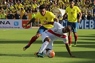 André Carrillo up against Ecuador's Cristian Ramírez during the 2018 qualifiers.