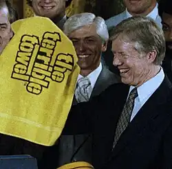 In 1938, the Pirates selected All-America quarterback Byron White from the University of Colorado with the fourth overall pick in the NFL draft, offering him a league-high salary of $15,000.[41] White initially declined to continue his education through a Rhodes Scholarship at Oxford University but reconsidered and signed the deal after deferring his start at Oxford.[42] He also received a share of the gate at exhibition games, bringing his total earnings to $15,800. White led the league in rushing with 567 yards but could not help the team improve, as the Pirates finished with a 2–9 record, including a season-ending six-game losing streak. After the season, White sailed to England and never returned to play for the Pirates, later becoming a U.S. Supreme Court Justice.[43][44][45] In response to disappointing results, Rooney pursued legendary coach Jock Sutherland, offering him a salary higher than the $13,000 Sutherland earned at the University of Pittsburgh, but Sutherland declined, likely due to his disdain for professional football. As a result, Johnny "Blood" McNally remained as head coach but retired as a player. The 1939 season began with another losing streak, and after a third consecutive loss, McNally resigned as coach. Despite his lackluster coaching record of 6–19 with the Pirates, McNally was inducted into the Pro Football Hall of Fame in 1963.[46][47]