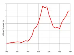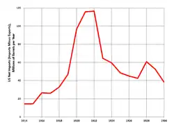 The high price of petroleum encouraged intensified exploration in the US and elsewhere, and eventually resulted in the discovery of large new petroleum deposits. American oil production surged in the early 1920s, particularly in north Texas and the Los Angeles Basin in California, driving down both imports and the price of oil.[27] A barrel of oil in the Midcontinent region lost almost two-thirds of its value, falling from US$3.50 at the start of 1921, to US$1.25 at year-end.[28] Imported oil peaked at 127 million barrels in 1923, then dropped by more than half, to 62 million in 1925.[17]
