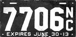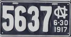 1913 | White serial on black porcelain plate; vertical "NC" at right and "EXPIRES JUNE 30-13" at bottom | none | 1234 | 6801 to approximately 8000 | Issued only to new registrants from April 1 through June 30, 1913, with serials following on from those on pre-state-issued plates.[3] |