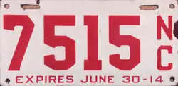 The U.S. state of North Carolina first required its residents to register their motor vehicles in 1907. Registrants provided their own license plates for display until 1913, when the state began to issue plates.[1]