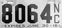 1915–16 | Black serial on gray porcelain plate; vertical "NC" at right and "EXPIRES JUNE 30-16" at bottom | none | 12345 | 1 to approximately 25000 | |