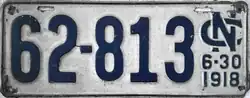 1917–18 | Embossed dark blue serial on white plate with border line; "NC" monogram and "6-30 1918" at right | none | 12-345 | 1 to approximately 65-000 | |