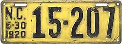 1919–20 | Embossed black serial on yellow plate with border line; "N.C. 6-30 1920" at left | none | 12-345 123456 |