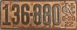 1921–22 | Embossed black serial on white plate with border line; "NC" monogram and "6-30 22" at right | none | 123-456 | 1 to approximately 213-000 | |