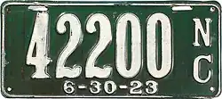 1922–23 | Embossed white serial on green plate with border line; vertical "NC" at right and "6-30-23" centered at bottom | none | 123456 | 1 to approximately 181000 | |