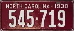 1930 | Embossed white serial on maroon plate with border line; "NORTH CAROLINA–1930" at top | none | 123-456 | 100-001 to approximately 607-000 | |
