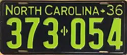 1936 | Embossed light green serial on black plate; "NORTH CAROLINA–36" at top | none | 123-456 | 100-001 to approximately 545-000 | |