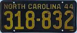 1944 | Embossed golden yellow serial on black plate; "NORTH CAROLINA 44" at top | none | 123-456 | 200-001 to approximately 707-000 | |