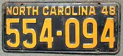 1948 | Embossed golden yellow serial on black plate; "NORTH CAROLINA 48" at top | none | 123-456 | 100-001 to approximately 760-000 | |