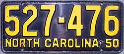 1950 | Embossed golden yellow serial on black plate; "NORTH CAROLINA 50" at bottom | none | 123-456 | 100-001 to 760-000 |