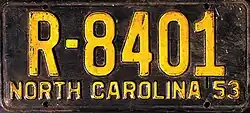 1953 | Embossed golden yellow serial on black plate; "NORTH CAROLINA 53" or "N.C.", slogan and "53" at bottom (see right) | none, or "DRIVE SAFELY" between state abbreviation and year | 123-456 | 100-001 to 760-000 |