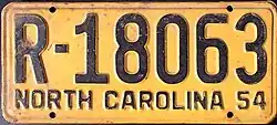 1954 | Embossed black serial on golden yellow plate; "NORTH CAROLINA 54" or "N.C.", slogan and "54" at bottom | none, or "DRIVE SAFELY" between state abbreviation and year | 123-456 | 100-001 to 760-000 |