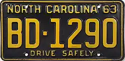 1963 | Embossed golden yellow serial on black plate with border line; "NORTH CAROLINA 63" at top | "DRIVE SAFELY" centered at bottom | A-1234 AB-1234 |
