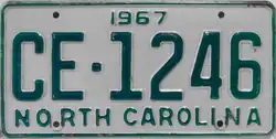 1967 | Embossed green serial on reflective white plate with border line; "1967" centered at top; "NORTH CAROLINA" at bottom | none | A-1234 AB-1234 |