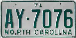 1971 | Embossed green serial on reflective white plate with border line; "71" centered at top; "NORTH CAROLINA" at bottom | none | A-1234 AB-1234 |
