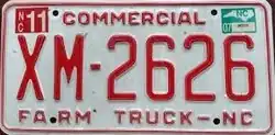 Farm Truck | Embossed red on white with border line; "COMMERCIAL" at top; "FARM TRUCK–NC" at bottom | WB-1234 XB-1234 YB-1234 |