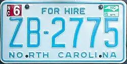 For Hire | 2006–present | Embossed blue on white with border line; "NORTH CAROLINA" at bottom; "FOR HIRE" at top | ZB-1234 | ZB-1001 to present | Issued annually through 2005.[9] Issuing ZM series as of September 27, 2020. |