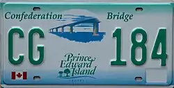 1997–2007 | Embossed green serial on reflective gradient green, white and blue plate; screened Confederation Bridge graphic at top centre and national flag at bottom left; "Prince Edward Island" screened in green below graphic with green trees, wavy blue underline, and "CANADA" below underline | "Confederation Bridge" screened in green at top | A1★23 | |||