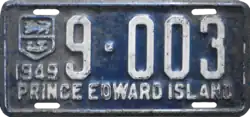 1949 | Embossed white serial on blue plate with border line; "PRINCE EDWARD ISLAND" at bottom; provincial shield and "1949" at left | none | 1-234 | 1-001 to approximately 9-999 | |