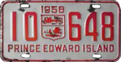1958 | Embossed red serial on white plate with border line; "1958" and provincial shield used as separator; "PRINCE EDWARD ISLAND" at bottom | none | 12-345 | 10-001 to approximately 25-600 | |