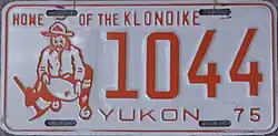 1975 | Orange on white with border line; orange embossed prospector at left with gold paint speck; "YUKON 75" at bottom | Home of the Klondike | 1234 | 1 to approximately 8000 | |